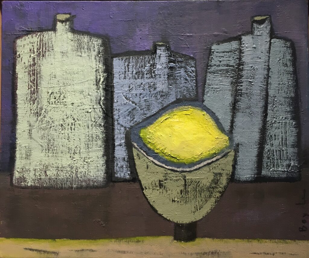 Her subject matter is therefore all about shape – cups, lemons and fish, people stylised like bottles…”I like their shapes – the squares, triangles, rounds and the space between them. But I’m better at colour than words,” she laughs again.