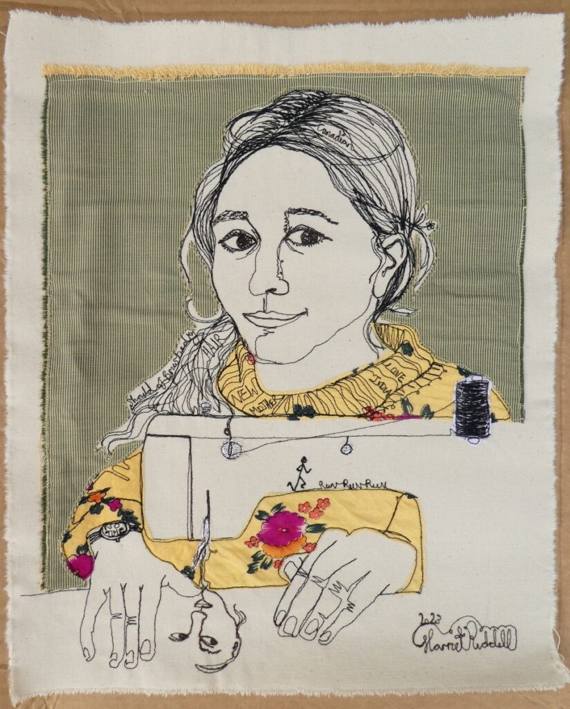 On Watlington High Street, a hive of Artweeks activity, portrait artist Harriet Riddell works with free-motion embroidery, stitching you as you stand in a single line of thread with surprising accuracy. https://www.artweeks.org/v/harriet-riddell/ Artweeks venue 141