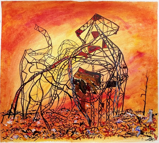 Expect the smouldering detritus of South London sitting alongside imagined scenes of destruction in Hiroshima and elsewhere across Europe, his paintings devoid of people, populated instead by planes, historic objects, architecture and nature to emphasise the apocalyptic landscapes he paints using striking, dramatic colours.