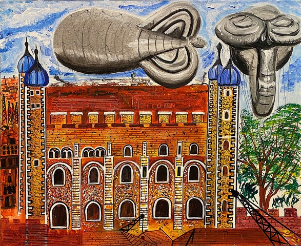 Returning to the project he started some years ago, the new exhibition represents some of his recollections of the war – a frequent theme being the a combination of the apocalyptic and banal where Bovril and beans clash with bombs, a German fighter plane lies amidst the haystacks of the English countryside and the Tower of London crouches beneath barrage balloons.