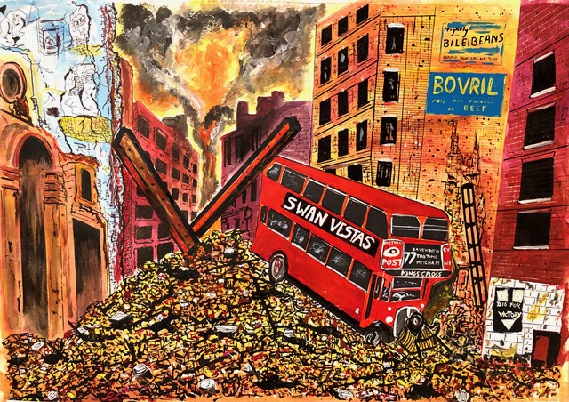 Returning to the project he started some years ago, the new exhibition represents some of his recollections of the war – a frequent theme being the a combination of the apocalyptic and banal where Bovril and beans clash with bombs, a German fighter plane lies amidst the haystacks of the English countryside and the Tower of London crouches beneath barrage balloons.