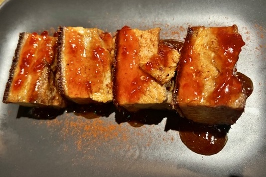 the crispy paprika pork belly with hot honey was unashamedly rustic – large, generous, moist, dripping chunks of superbly cooked meat topped with a thin layer of crispy skin