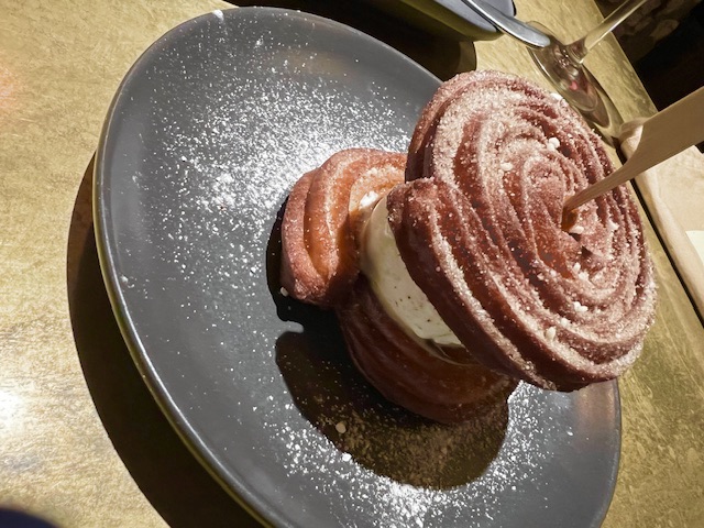 But it was the hot churro ice cream sandwich, clotted ice cream and cinnamon sugar (£10) that took the biscuit, literally, and so indecent and naughty it needed to be put in the corner and spanked. Hot fried light sugary dough, encasing soft creamy ice cream, we went back time and time again, our spoons clashing in our haste to finish every last morsel.