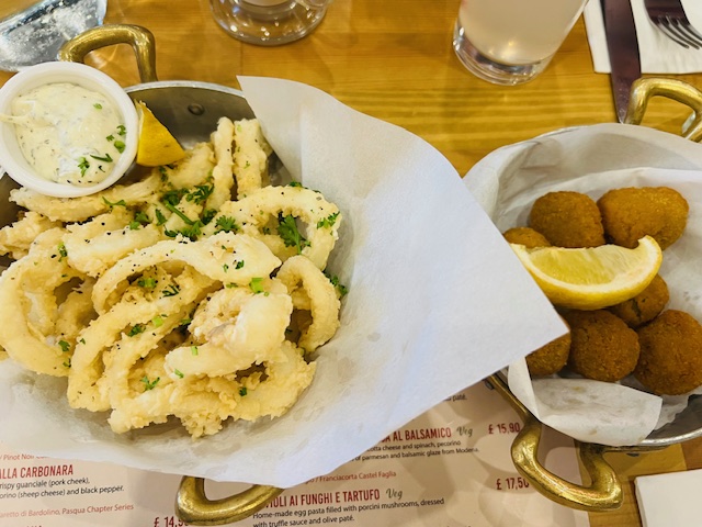 To start then, the pork stuffed fried olives (ascolane) (£7.50), the pinsa bread with pistachio pesto and Sicilian yellow tomato sauce (£6.50) and the calamari fritti with lemon and garlic aioli (£7.90). The pinsa was perhaps the most unusual, like pizza crusts served with two dips – the pistachio crunchy, sweet and salty, the yellow tomato, light and sweet.