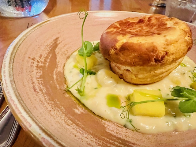 We ordered – the crispy duck egg celeriac veloute, hazelnut and sage crumb (£10.50), the twice-baked Wookey Hole Cheddar soufflé, smoked haddock chowder (£11) because it’s kind of obligatory, then the roasted monkfish with curried cauliflower, pak choi, dukkah and saffron cream (£28), and the pressed pork belly with cider-braised sweet onion, burnt apple ketchup and potato fondant (£27).
