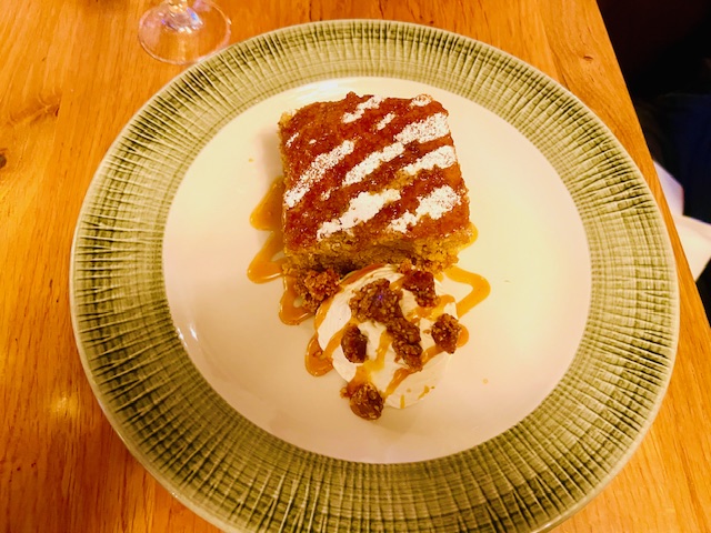 After such a dazzling start, of course we had to follow it up with dessert. The pumpkin and ginger sponge with oat milk caramel, and pecan praline (£10) sounded both ingenious and curious, and it was. Being a vegan dish might put some people off but it was rich and vibrant with a punch of spice, earthy and sweet with pumpkin, and then the bite of nut.