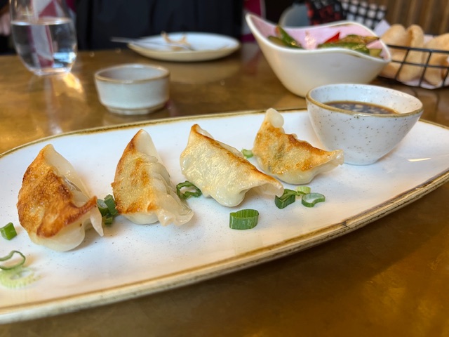 Then the delicious pan-fried gyoza stuffed with chicken, served on a long thin plate with dipping sauce (£7.95) and some veg bao buns which were fluffy, light and bouncy, because that’s the thing about Chinese food, it’s as much about texture as it is about taste.