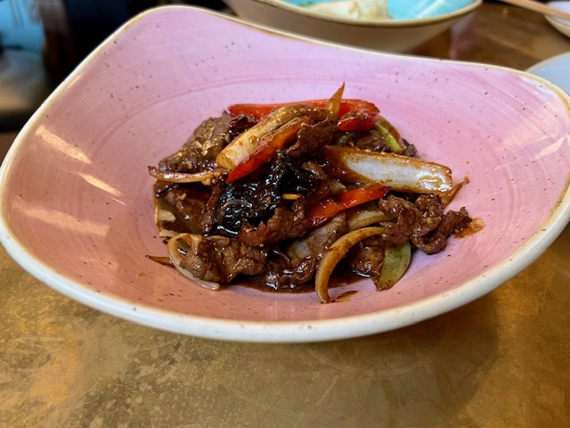 Arriving promptly, speed being of the essence here, in this hub of consumerism, the mains followed on thick and fast – the pungent, juicy, black pepper beef (£16.95) and the slippery, spicy, veg fried noodles (£14.95), both packed full of flavour.