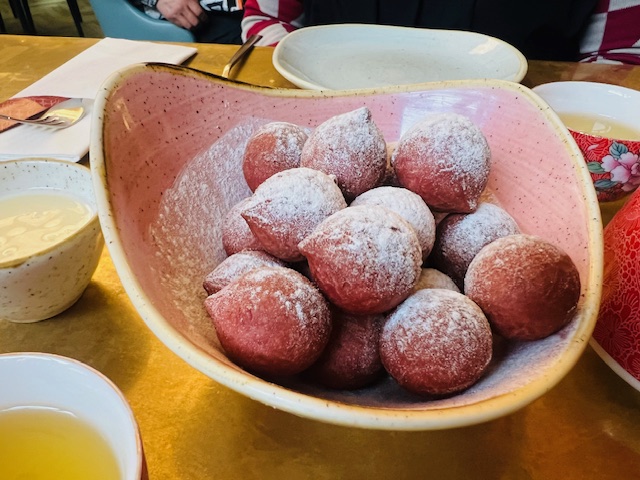 But it was the dessert that provided the biggest surprise of the day – the sweet potato balls (£7.50) – so intriguing that we had no idea what to expect, our curiosity amply rewarded by the sugar dusted, pale pink orbs – crispy and light on the outside, chewy and sweet within, and completely moreish.