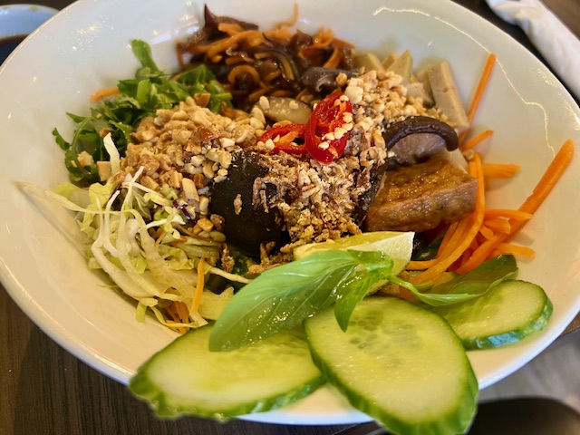 And the ‘bun tron chay with tofu and rice vermicelli (£13.50), all the ingredients laid out enticingly on top of the noodles with a little pot of soya sauce, which you pour over and mix up. But the differentiating textures and flavours, plentiful chunks of mushrooms replacing the meat, keep you burrowing away until the bowl is empty. Ingenious.