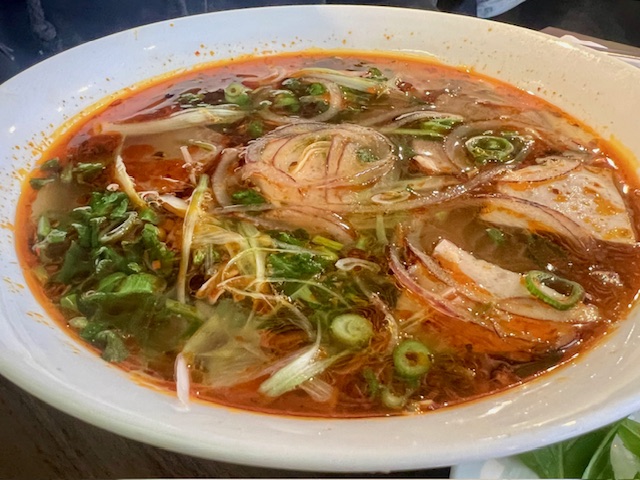 In the end we settled on three staples, agreeing to share, although once the dishes arrived, there was little disseminating going on. A pho, because it’s almost obligatory – here with spicy beef – the beef stew, and the veggie vermicelli noodles.