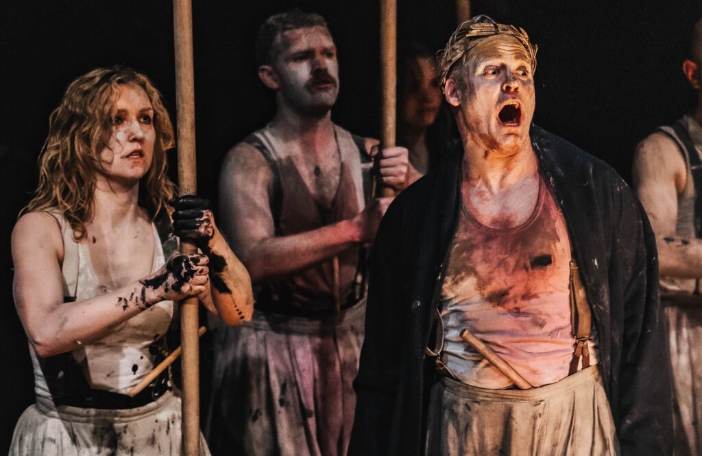 The eight-strong cast all wear earthy, grey costumes that put the setting outside of any particular historical moment and contributes to the appropriately murky, primeval atmosphere – a fitting one in which to convey the story of the Macbeth couple’s ambitious yet catastrophic life-choices and consequently, their descent into madness.