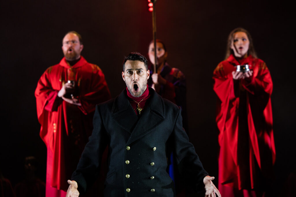 At the chilling end of Act I, the electric crosses glow red and the innocent children’s chorus singing the Te Deum fall under his demonic control. Through torture and deceit he continues his march of destruction throughout Act II until the courageous Tosca thwarts his plans.