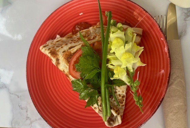 Open seven days a week, we decided to stay for lunch. Fresh banana milkshakes appearing instantly, some sterling coffees and then a variety of crepes, beautiful to behold, presentation everything here, decorated with edible flowers.