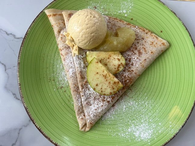 From the extensive savoury crepe menu – the pizza crepe – with pepperoni, cheddar, mozzarella, tomatoes, mushrooms, spinach and sweetcorn (£13) (you can remove or swap any pot the ingredients you don’t fancy), the Pesto – (home-made), tomatoes, mushrooms, spinach, sun-dried tomato and sweetcorn (£13), bursting with goodies, neatly folded, the crepe light and crisp but satisfyingly chewy.