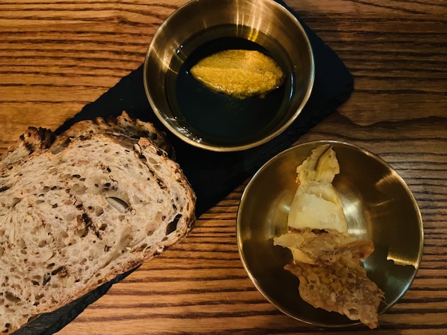 First up the marinated Gordal olives (OK we might have cheated on this one but they are a must – the biggest, juiciest olives out there), to accompany a lovely bottle of Pinot Noir, and the sourdough, miso and onion butter, chicken skin and sun blush tomato tapenade. (£7)