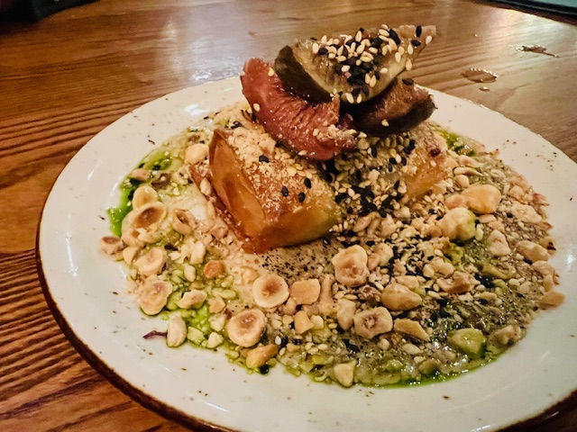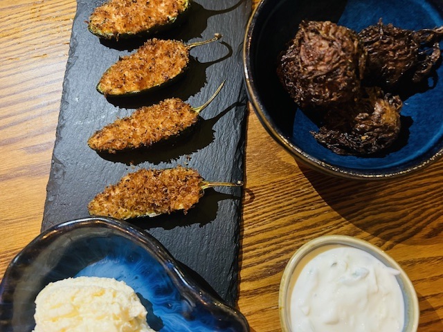 Then a dish from the specials – jalapeño poppers with cream cheese and horseradish, the chillies filled with cheddar, paprika, garlic, Pangritata (grated, flavoured breadcrumbs known as poor man’s Parmesan) and baked. Delicious and novel.