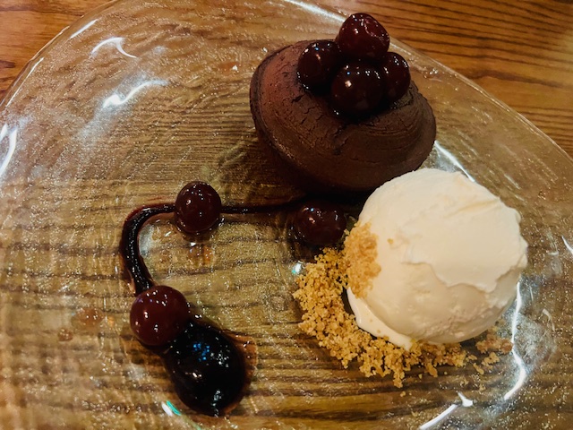 The sharp posset was enlivened by the tropical fruit and the crunch and stick of the honeycomb, while the gooey, thick, dark, chocolate oozing out of the light fondant case, and the macerated cherries cutting against the cold ice cream was absolutely delightful.