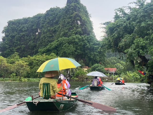 We emerged the next day in the pouring rain, which is so torrential it’s biblical, until it suddenly stops and the sun pops out as if nothing’s happened, your clothes left steaming. Boarding bamboo boats two-at time, like Noah’s ark we made our way up the Ngo Dong River, rowed by boatmen and women using their feet, a sight you soon get used to as you pass through through grottos filled with stunning stalactites, rice being farmed around us.