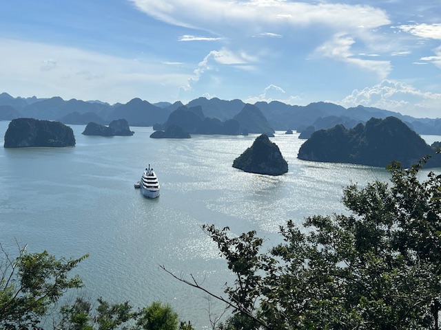 Halong Bay was next on our hit list, this time our form of water transport a luxury cruise ship Paradise Elegance, beautifully decorated with wooden panels within and lovely comfy rooms, the service and food immaculate, the views from the roof incredible, a cocktail bar and small pool perfect for relaxing, complete with Buddhist monks, while we watched the stunning sunset.