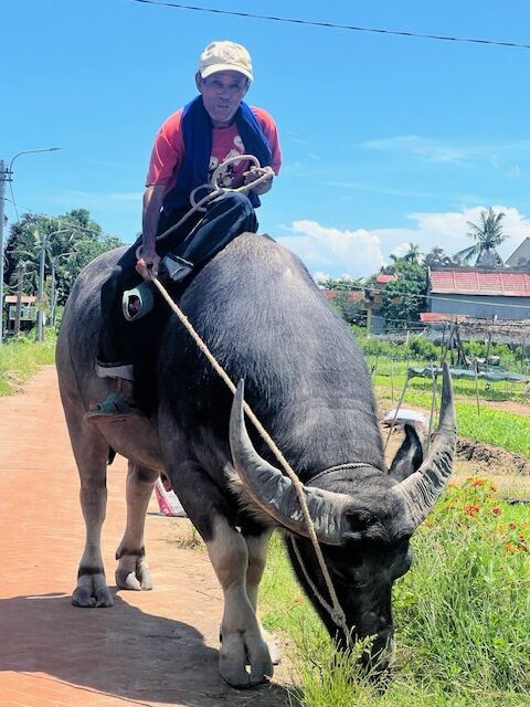 Emerging into paddy fields and water buffalo, rice dryng on the paths, we stopped at Tra Que Organic Vegetable Village – a restaurant and cooking school where we made rice paper for Vietnamese rolls and enjoyed a long lunch, and a divine foot and shoulder massage, before winding our way back, stopping at the water coconut forest—once used by the Viet Cong during the war – for a comical boat trip in traditional round basket boats.